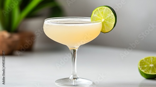 A refreshing classic cocktail in a coupe glass with a smooth pale golden hue garnished with a thin lime wheel