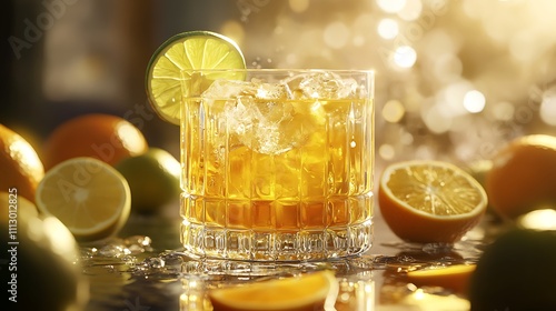 A refreshing cocktail with citrus garnishes, set in a warm, inviting atmosphere.