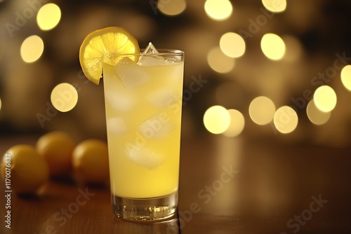 A refreshing glass of lemonade garnished with a lemon slice and ice.