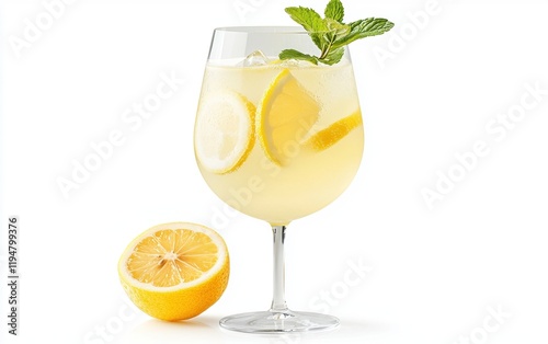 A refreshing glass of lemonade with floating lemon slices and a sprig of mint, placed on a clean white background