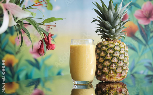 A refreshing glass of pineapple smoothie with a ripe pineapple, set on a table against a soft, lush green nature background, evoking tropical vibes and summer freshness.