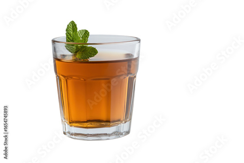 A Refreshing Herbal Tea: A captivating close-up of a refreshing herbal tea, beautifully presented in a glass, garnished with fresh mint leaves. An inviting scene to quench your thirst.