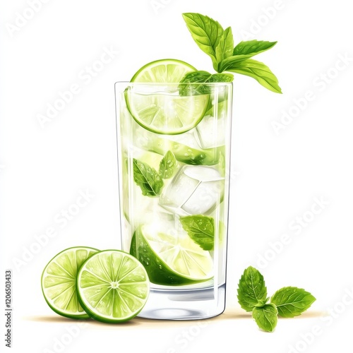 A refreshing Mojito with lime slices and mint leaves, positioned against an isolated white background, cubism art style