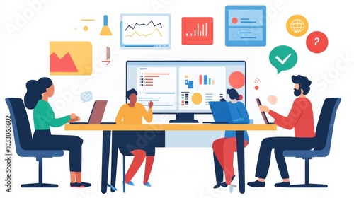 A remote team meeting, discussing digital marketing design strategies via video conferencing tools, with charts and wireframes visible