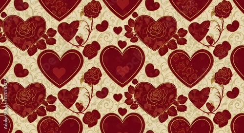 A repeating design of hearts and roses for a romantic Valentine's Day theme