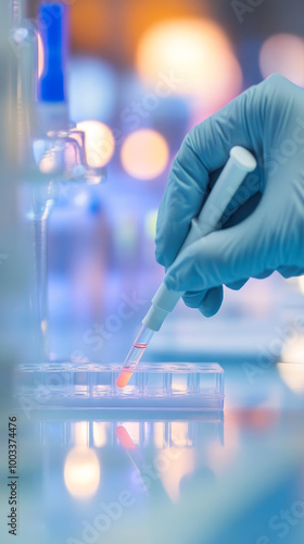 A researcher is carefully performing an antigen test using pipette in laboratory setting, showcasing precision and focus in vibrant environment