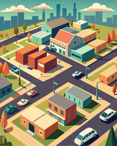 A residential neighborhood now surrounded by unsightly industrial buildings and sprawling parking lots.. Vector illustration