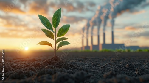 A resilient plant sprouting from soil against a backdrop of industrial pollution, symbolizing hope for environmental recovery.