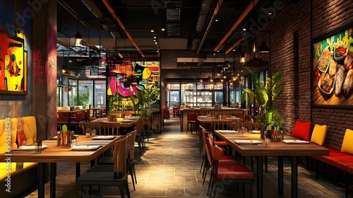 A restaurant interior featuring dynamic 3D-rendered themes and vibrant decor