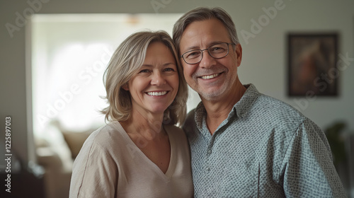 A retired couple stands close together, sharing a joyful moment in their inviting living room filled with natural light