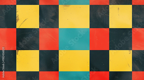 A retro-style checkerboard pattern in alternating bold colors like red, yellow, and blue