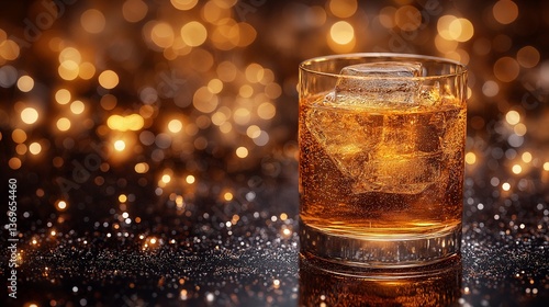 A rich golden whiskey served in a tumbler glass with large ice cubes, set against a sparkling bokeh background. A luxurious scene perfect for beverage branding, nightlife themes