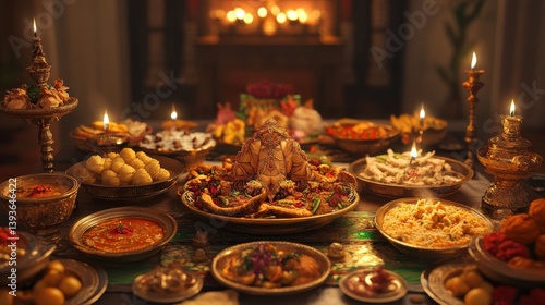 A richly decorated dining table displaying a variety of prepared dishes