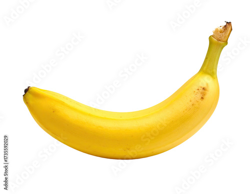 A ripe, yellow banana with a brown tip and stem isolated on a black background