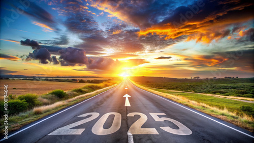 A road stretches towards a brilliant sunset, with the inscription "2025" prominently displayed on the asphalt, symbolizing the journey ahead. New year, new hopes. AI generated.