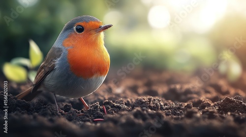 A robin perches on rich, dark soil.