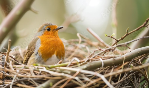 A Robin Sits Perched in Its Nest Surrounded by Twigs and Greenery During the Early Morning Hours