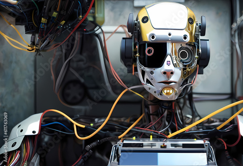 a robot artificial intelligence, cyborg, android, AI, Neural networks, Digital Twin, human-machine interfaces, wires face , computer head, Ai-Mitsu, cybernetics, cyberpunk art, future human, humanity