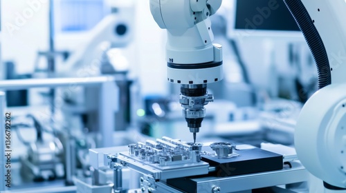 A robotic arm in a nanomaterial research facility, assembling nano-manufacturing equipment with AI precision for advanced material science, Nano-tech style