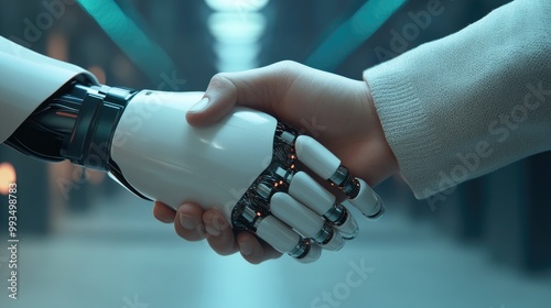 A robotic hand shaking hands with a human hand, symbolizing the collaboration between humans and AI in modern technology.