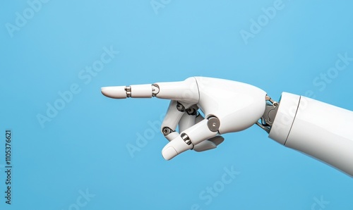 A robotic hand signaling or pointing in a clean, modern design against a blue background, representing innovation and automation.