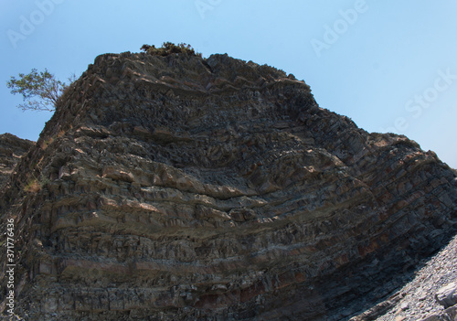 A rock wall against a blue sky. beautiful rocky outdoor mountain
