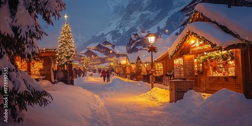 a romantically illuminated Christmas market in the evening with many stalls in deep snow