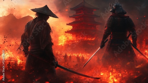 A ronin in tattered robes standing against a heavily armored samurai, their swords glinting in the fiery light of a distant burning village