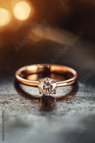 A rose gold ring with a diamond, featuring a minimal design, placed on a black table.
