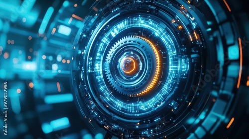 A rotating gear mechanism inside a spacecraft engine, glowing with alien technology as it prepares for fasterthanlight travel