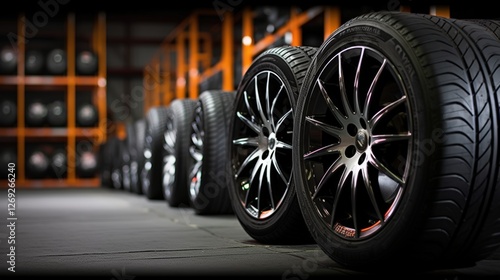 A row of black alloy wheels lined up in a storage area, showcasing their sleek design and sturdy tires, with organized shelves in the background.