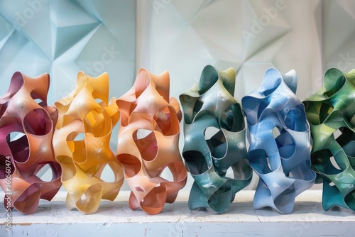 A row of colorful paper sculptures are displayed on a white shelf