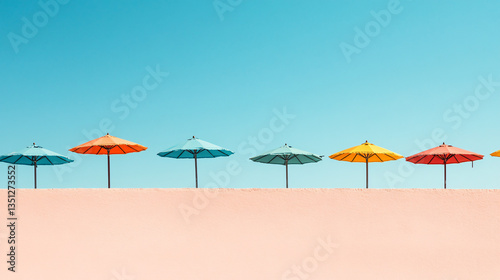 A row of colorful umbrellas neatly arranged on a wall creating a stunning visual display of bright hues for a playful and artistic aesthetic.