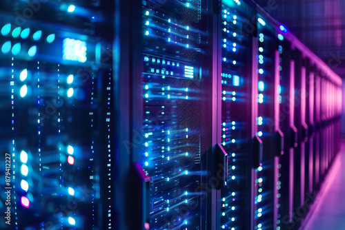 A row of computer servers with blue lights on them, generative ai image.