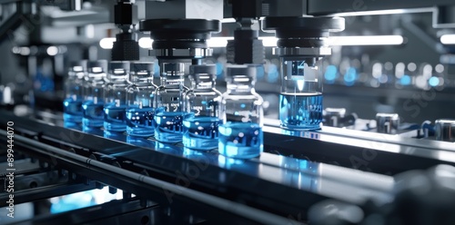 A Row of Glass Bottles Filled with Blue Liquid Moving Along a Conveyor Belt in a Modern Factory