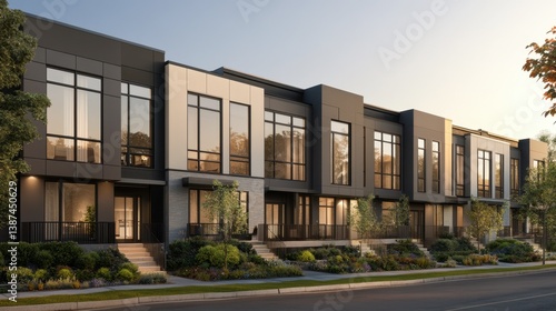 A row of stylish modern townhouses featuring neutral tones, geometric architecture, and contemporary landscaping.