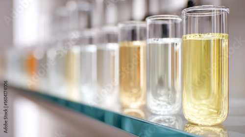 A row of test tubes filled with clear liquid on an elegant glass shelf, representing the scientific and medical equipment used in data analysis for global health monitoring