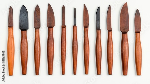 A row of various wooden-handled knives, showcasing different blade shapes and sizes, ideal for crafting or culinary use.