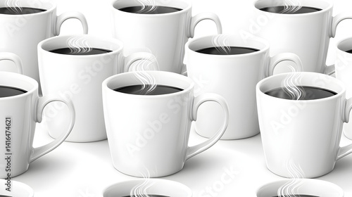 A row of white coffee cups with steam coming out of them. Generated using AI.