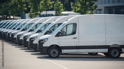 A row of white delivery vans parked neatly in a large parking area. The vans belong to a transporting service company.