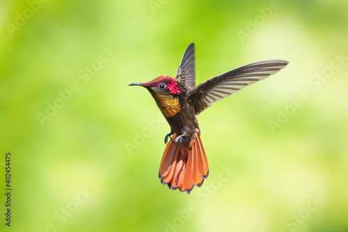 A Ruby Topaz hummingbird (Chrysolampis mosquitus) hovering in the air with a smooth background. Hummingbird with tail flared.