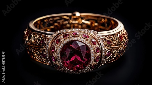A ruby-encrusted bracelet with intricate gold detailing, isolated on black.