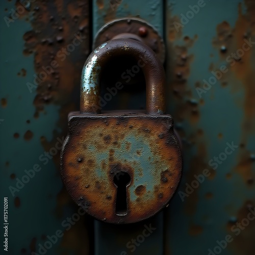 A rusted, weathered padlock with a keyhole set against a green, textured background.