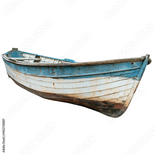A rustic blue and white rowboat isolated on a clean backdrop. The boat displays signs of weathering and age, hinting at stories of journeys on the water
