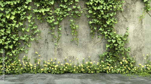 A rustic concrete wall intertwined with vibrant green ivy and small clusters of pale yellow blossoms, creating a serene and artistic scene