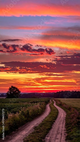 A rustic dirt road winds through a field at sunset. Vibrant colors paint the sky with hues of orange, pink, and purple.