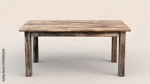 A rustic farmhouse dining table made of reclaimed wood, featuring visible grain texture, isolated on a neutral background