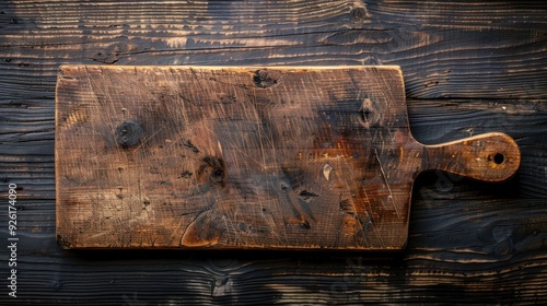A rustic wooden cutting board on a dark wooden surface, perfect for culinary presentations or rustic-themed backgrounds.