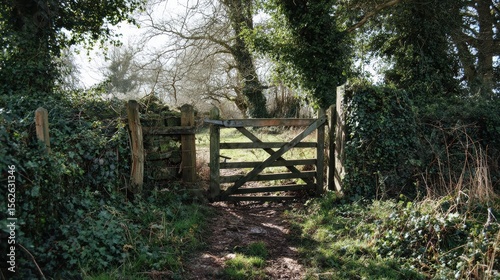 A rustic wooden gate surrounded by lush greenery and trees, inviting nature lovers to explore the serene countryside.