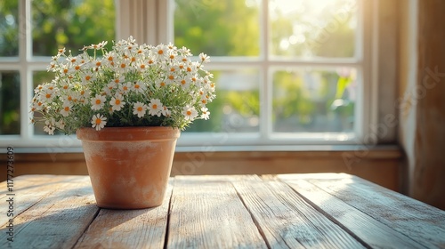 A rustic wooden shelf in soft daylight with a potted plant, conveying simplicity, nostalgia, and natural decor for cozy interiors or product styling.